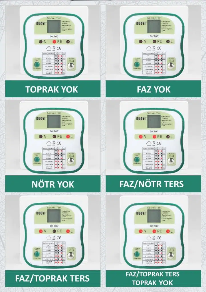 DUOYI DY207 Priz Topraklama Test Cihazı, prizlerin topraklama, faz ve nötr bağlantılarını hızlı ve güvenli şekilde test etmek için tasarlanmış pratik bir test cihazıdır. Elektrik ustaları, teknisyenler ve ev kullanıcıları için idealdir.