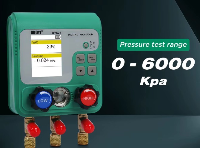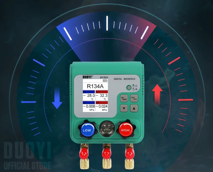 DUOYI DY523 Dijital Manifold Metre, klima, buzdolabı ve soğuk hava deposu bakım ve kurulumu yapan profesyoneller için özel olarak tasarlanmıştır. Bu cihaz, basınç, vakum ve sıcaklık ölçümlerini tek bir elde toplayarak iş akışınızı hızlandırır.