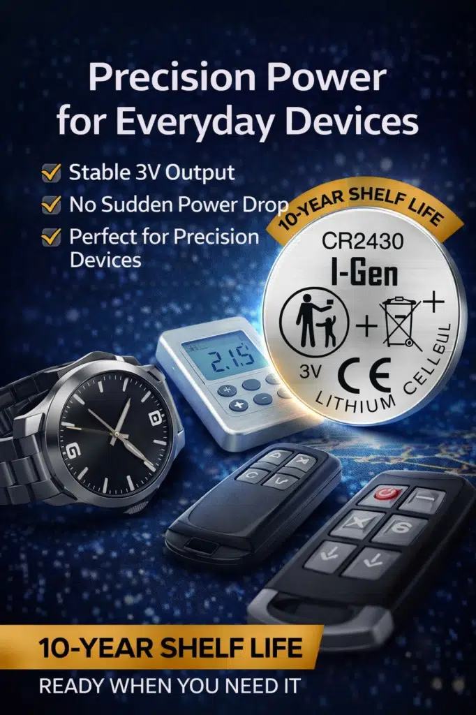 I-Gen CR2430 lityum piller, geniş gövde yapısı sayesinde diğer düğme pillere oranla daha fazla enerji depolar. Özellikle otomobil anahtarları, tıbbi cihazlar ve endüstriyel kontrol üniteleri için tasarlanmıştır. 3 Volt kararlı çıkışı ve yüksek deşarj kapasitesiyle cihazlarınızın performansını en üst seviyeye taşır.