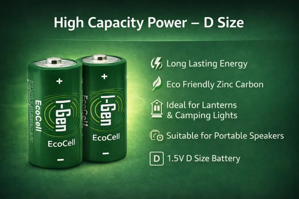 I-Gen Ecocell Çinko Karbon D Boy (R20P) piller, düşük ve orta enerji tüketimi gerektiren cihazlar için uygun maliyetli ve güvenilir bir enerji kaynağı sunar.1.5V sabit voltajı sayesinde cihazlarınızda istikrarlı bir performans sağlar.El fenerleri, taşınabilir radyolar, oyuncaklar ve diğer D boy pil gerektiren cihazlar için idealdir.