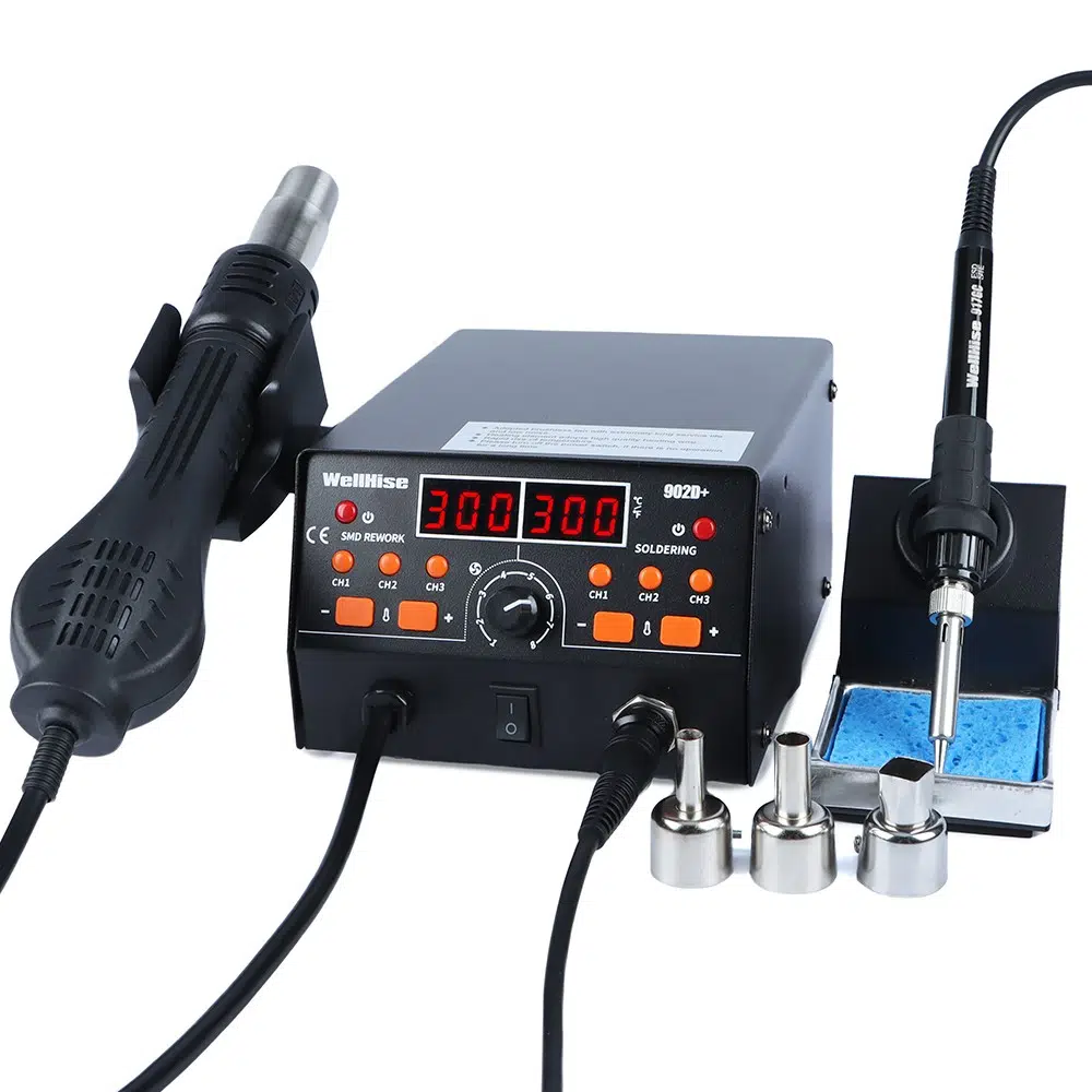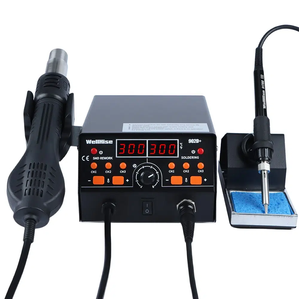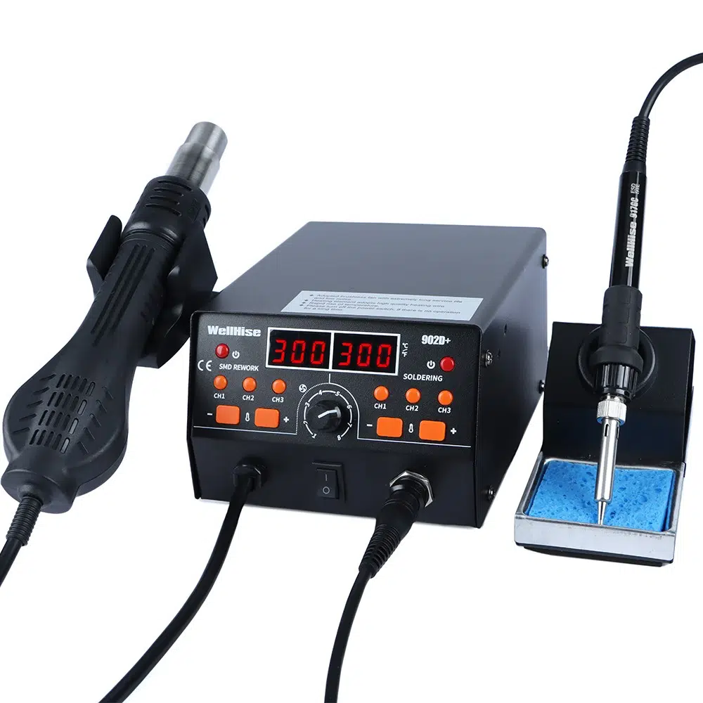 WellHise 902D+, hem sıcak hava hem de klasik havya işlevini bir arada sunan 2’si 1 arada profesyonel lehimleme istasyonudur.