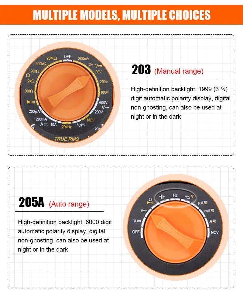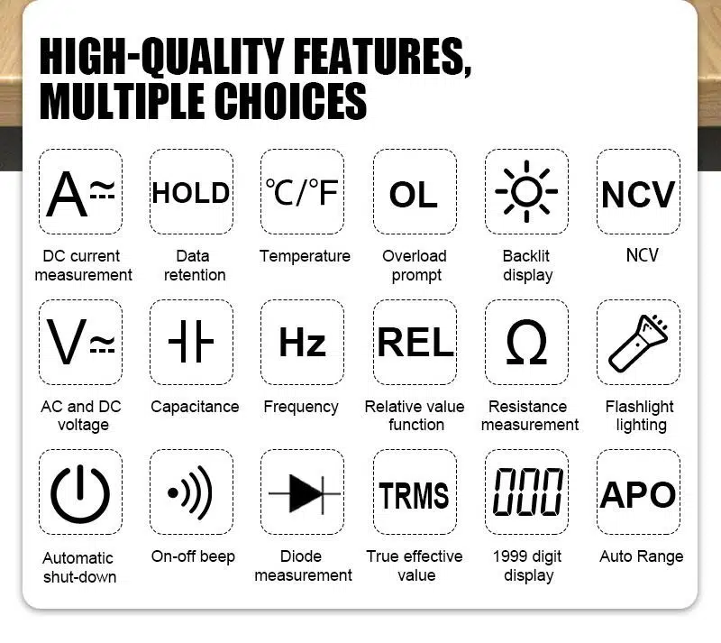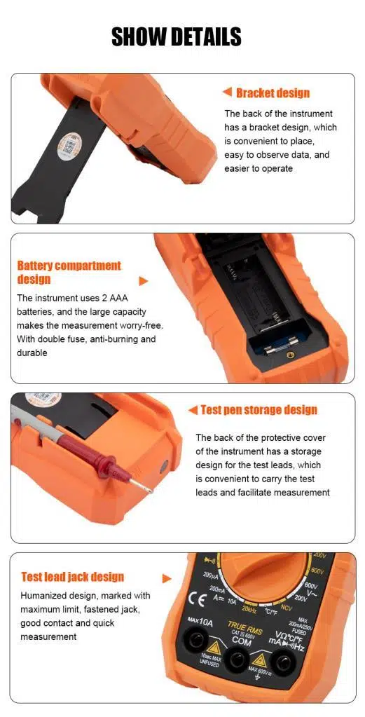 Bu DCV, ACV, DCA, direnç, sıcaklık, frekans, diyot, süreklilik testi ölçmek için 3 1/2 basamak, tam fonksiyon ve yüksek performans küçük ve güvenli dijital multimetre, böylece kullanıcılar için taşınabilir ve ideal bir araçtır..