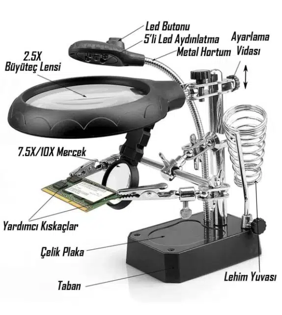 Entegre LED aydınlatması, ayarlanabilir yardımcı kolları ve büyüteçli camı sayesinde detaylı çalışmalarda mükemmel görüş sağlar.
