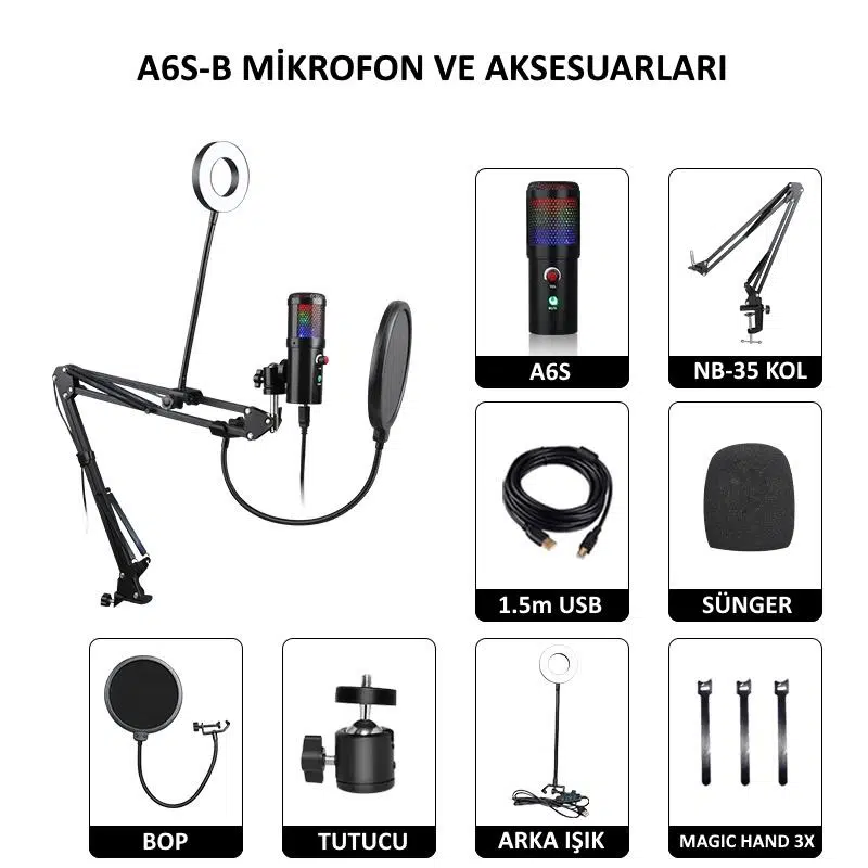 A6S-B mikrofon seti kayıt, streaming, uzaktan eğitim, yayıncılık vb. tüm alanlarda kullanılabilecek ses kalitesi stüdyo kalitesinde ses kaydı alabileceğiniz kaliteli bir mikrofon setidir.